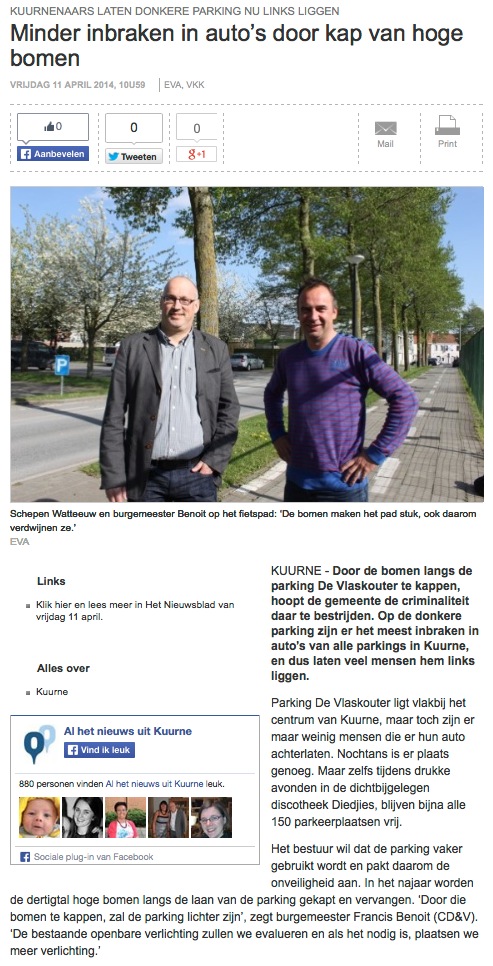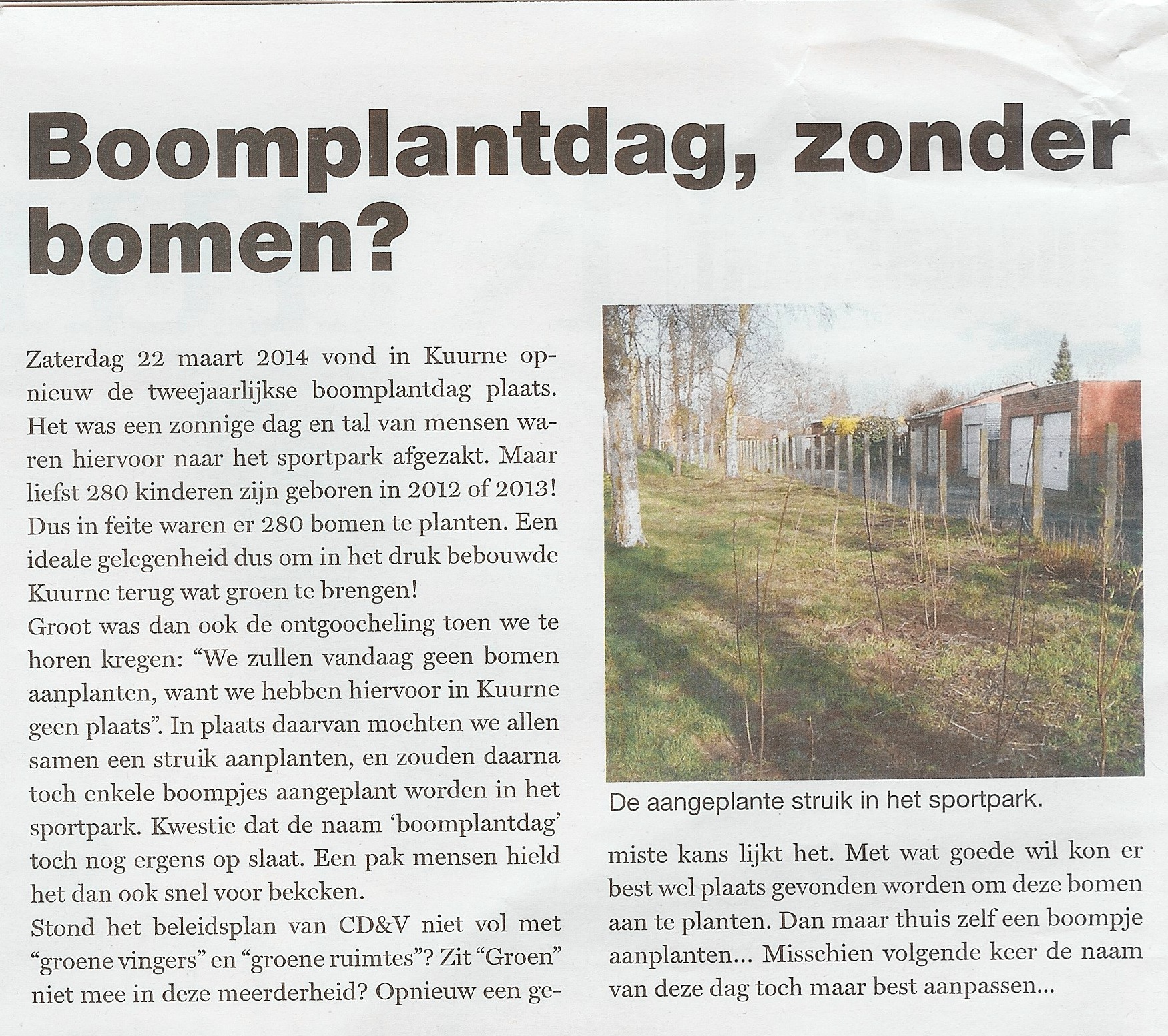 In de ‘Lokale Burgerkrant‘, een uitgave van Open Vld-Kuurne, lazen we een artikel dat ons enkel kan verontrusten. Er staat immers letterlijk: “Wij zullen vandaag geen bomen aanplanten, want we hebben hiervoor in Kuurne geen plaats”. Einde citaat van een aangehaald maar niet genoemd bestuurslid van de CD&V/N-VA/Sp.a.Groen-meerderheid.