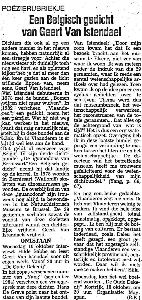 Dat geldt al evenzeer voor België. In zijn derde dichtbundel „De iguanodons van Bernissart” “Een Belgisch gedicht” neemt hij dat landje op de korrel. In 1978 worden in Bernissart (Wallonië) skeletten van dinosaurussen gevonden. De overblijfselen van deze „iguanodons” zijn trouwens nog altijd te bewonderen in het Natuurhistorisch Museum te Brussel. De 39 gedichten verhalen zowat de vondst van deze skeletten uiteraard vanuit een dichterlijke vrijheid. Geert Van Istandaels vrijheid.