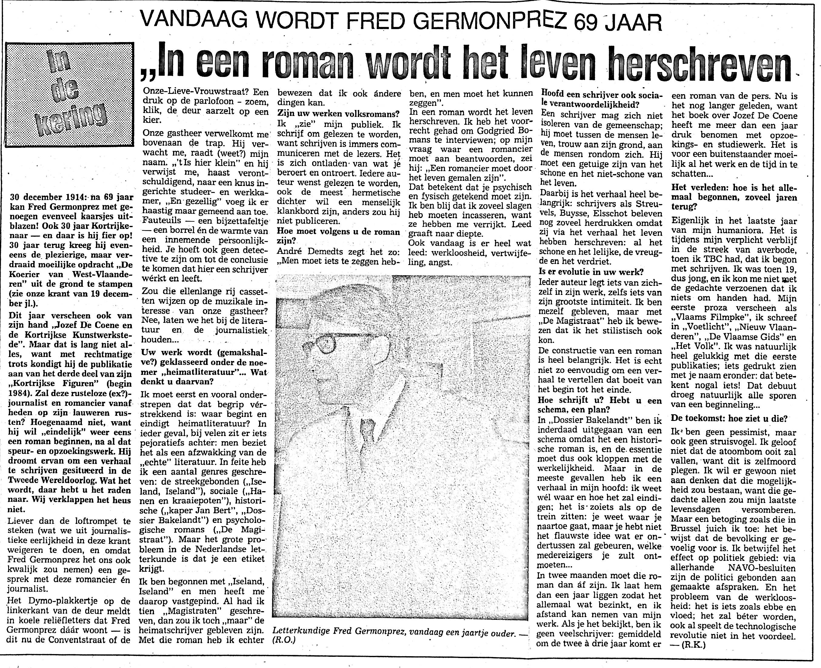 30 december 1914: na 69 jaar kan Fred Germonprez met genoegen evenveel kaarsjes uitblazen! Ook 30 jaar Kortrijkenaar — en daar is hij fier op! 30 jaar terug kreeg hij eveneens de plezierige, maar verdraaid moeilijke opdracht „De Koerier van West-Vlaanderen” uit de grond te stampen (zie onze krant van 19 december jl.).