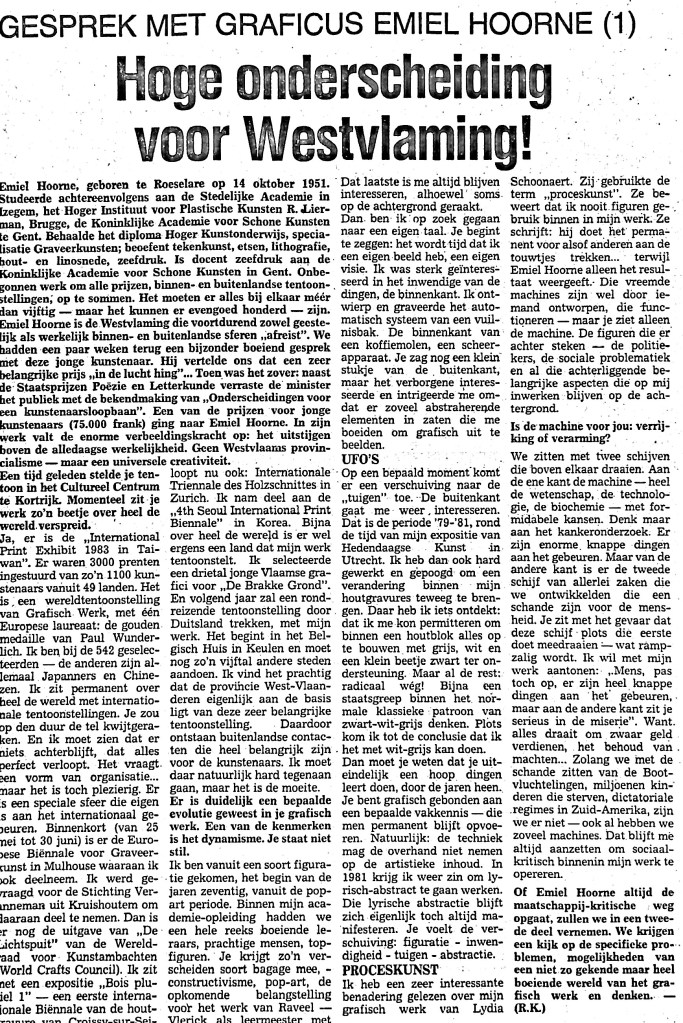 Emiel Hoorne, geboren te Roeselare op 14 oktober 1951. Studeerde achtereenvolgens aan de Stedelijke Academie in Izegem, het Hoger Instituut voor Plastische Kunsten in Izegem, de Koninklijke Academie voor Schone Kunsten R. Lierman, Brugge, de Koninklijke academie voor Schone Kunsten te Gent. Behaalde het diploma Hoger Kunstonderwijs, specialisatie Graveerkunsten; beoefent tekenkunst, etsen, lithografie, hout- en linosnede, zeefdruk. Is docent zeefdruk aan de Koninklijke Academie voor Schone Kunsten in Gent. Onbegonnen werk om alle prijzen, binnen- en buitenlandse tentoonstellingen, op te sommen. Het moeten er alles bij elkaar méér dan vijftig — maar het kunnen er evengoed honderd — zijn. Emiel Hoorne is de West-Vlaming die voortdurend zowel geestelijk als werkelijk binnen- en buitenlandse sferen „afreist”. We hadden een paar weken terug een bijzonder boeiend gesprek met deze jonge kunstenaar. Hij vertelde ons dat een zeer belangrijke prijs „in de lucht hing”… Toen was het zover: naast de Staatsprijzen Poëzie en Letterkunde verraste de minister het publiek met de bekendmaking van „Onderscheidingen voor een kunstenaarsloopbaan”. Een van de prijzen voor jonge kunstenaars (75.000 frank) ging naar Emiel Hoorne. In zijn werk valt de enorme verbeeldingskracht op: het uitstijgen boven de alledaagse werkelijkheid. Geen West-Vlaams provincialisme — maar een universele creativiteit, er is de „International Print Exhibit 1983 in Taiwan”. Er waren 3000 prenten ingestuurd van zo’n 1100 kunstenaars vanuit 49 landen. Het is een wereldtentoonstelling van Grafisch Werk, met één Europese laureaat: de gouden medaille van Paul Wunderlich. Ik ben bij de 542 geselecteerden — de anderen zijn allemaal Japanners en Chinezen. Ik zit permanent over heel de wereld met internationale tentoonstellingen. Je zou op den duur de tel kwijt geraken. En ik moet zien dat er niets achterblijft, dat alles perfect verloopt. Het vraagt, een vorm van organisatie… maar het is toch plezierig. Er is een speciale sfeer die eigen is aan het internationaal gebeuren. Binnenkort (van 25 mei tot 30 juni) is er de Europese Biënnale voor Graveerkunst in Mulhouse waaraan ik ook deelneem. Ik werd gevraagd voor de Stichting Veranneman uit Kruishoutem om daaraan deel te nemen. Dan is er nog de uitgave van „De Lichtspuit” van de Wereldraad voor Kunstambachten World Crafts Council). Ik zit met een expositie „Bois pluriel 1” — een eerste internationale Biënnale van de houtgravure van Croissy-sur-Seine in Frankrijk. „Xylon 9” loopt nu ook: Internationale Triënnale des Holzschnittes in Zurich. Ik nam deel aan de „4th Seoul International Print Biënnale” in Korea. Bijna over heel de wereld is er wel ergens een land dat mijn werk tentoonstelt. Ik selecteerde een drietal jonge Vlaamse grafici voor „De Brakke Grond”. En volgend jaar zal een rondreizende tentoonstelling door Duitsland trekken, met mijn werk. Het begint in het Belgisch Huis in Keulen en moet nog zo’n vijftal andere steden aandoen. Ik vind het prachtig dat de provincie West-Vlaanderen eigenlijk aan de basis ligt van deze zeer belangrijke tentoonstelling. Daardoor ontstaan buitenlandse contacten die heel belangrijk zijn voor de kunstenaars. Ik moet daar natuurlijk hard tegenaan gaan, maar het is de moeite.