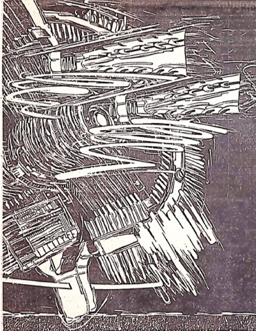 Op een bepaald moment komt er een verschuiving naar de „tuigen” toe. De buitenkant gaat me weer interesseren. Dat is de periode ’79-’81, rond de tijd van mijn expositie van Hedendaagse Kunst in Utrecht. Ik heb dan ook hard gewerkt en gepoogd om een verandering binnen mijn houtgravures teweeg te brengen. Daar heb ik iets ontdekt: dat ik me kon permitteren om binnen een houtblok alles op te bouwen met grijs, wit en een klein beetje zwart ter ondersteuning. Maar al de rest: radicaal wég! Bijna een staatsgreep binnen het normale klassieke patroon van zwart-wit-grijs denken. Plots kom ik tot de conclusie dat ik .het met wit-grijs kan doen. Dan moet je weten dat je uiteindelijk een hoop dingen leert doen, door de jaren heen. Je bent grafisch gebonden aan een bepaalde vakkennis — die men permanent blijft opvoeren. Natuurlijk: de techniek mag de overhand niet nemen op de artistieke inhoud. In 1981 krijg ik weer zin om lyrisch-abstract te gaan werken. Die lyrische abstractie blijft zich eigenlijk toch altijd manifesteren. Je voelt de verschuiving: figuratie – inwendigheid – tuigen – abstractie.