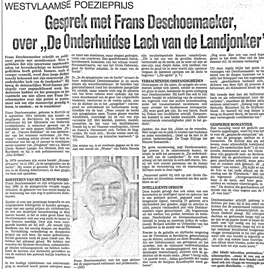 Frans Deschoemaeker schrijft en publiceert poëzie met mondjesmaat. Weer is gebleken dat zijn spaarzame opgehouden adem tot levenskrachtige en kernachtige gedichten heeft geleid. Immers, zoals al vroeger vermeld, werd deze jonge dichter terecht bekroond met zijn manuscript „De onderhuidse lach van de Landjonker”. Hij kreeg de driejaarlijkse West-Vlaamse poëzieprijs voor ongepubliceerd werk. Ondertussen hadden we het genoegen en het voorrecht om niet alleen met Frans Deschoemaeker over zijn poëzie te praten, maar ook om zijn manuscript grondig te lezen, te smaken… en te waarderen!