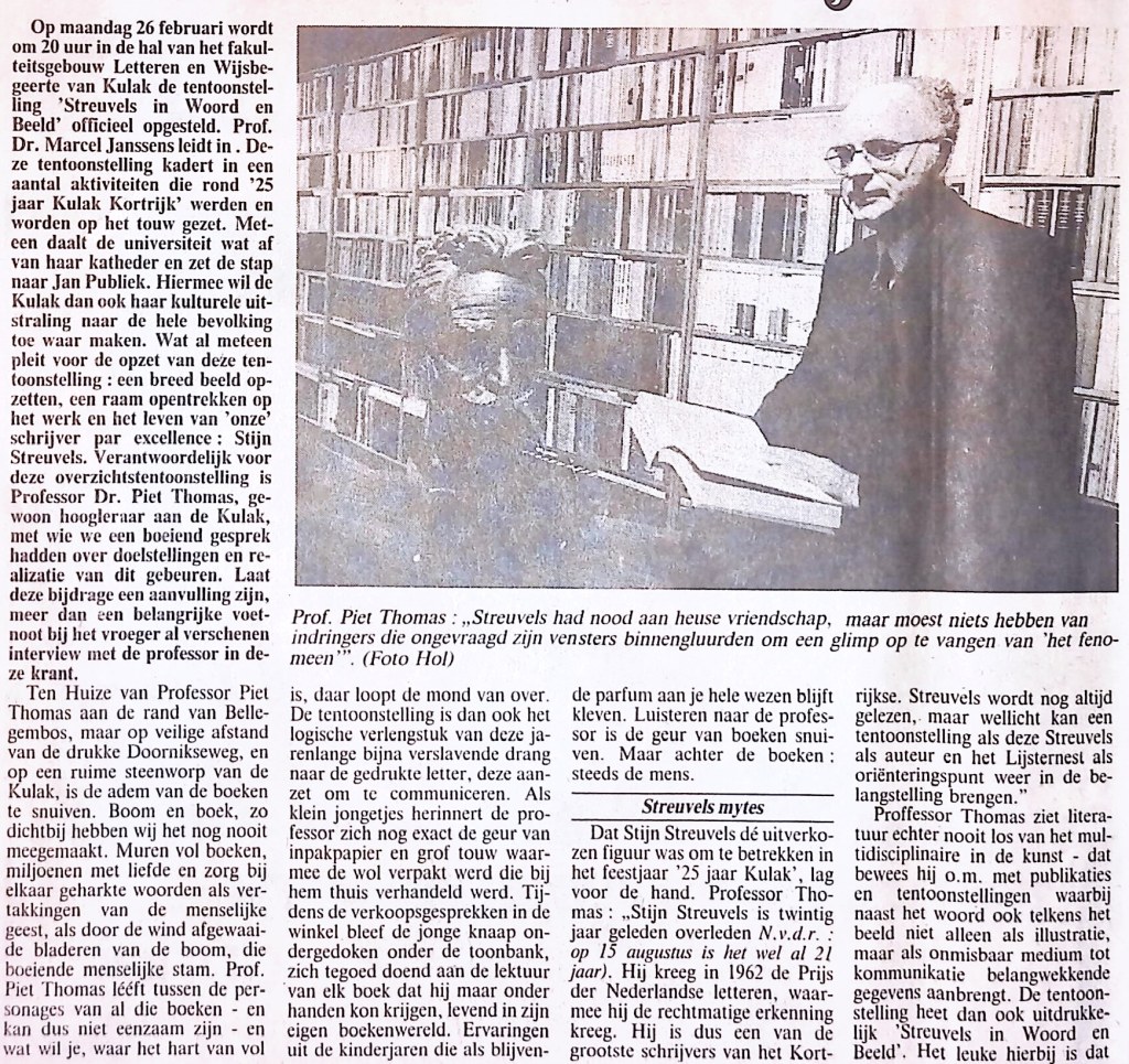 Op maandag 26 februari wordt om 20 uur in de hal van het faculteitsgebouw Letteren en Wijsbegeerte van Kulak de tentoonstelling ’Streuvels in Woord en Beeld’ officieel opgesteld. Prof. Dr. Marcel Janssens leidt in. Deze tentoonstelling kadert in een aantal activiteiten die rond ’25 jaar Kulak Kortrijk’ werden en worden op het touw gezet. Meteen daalt de universiteit wat af van haar katheder en zet de stap naar Jan Publiek. Hiermee wil de Kulak dan ook haar culturele uitstraling naar de hele bevolking toe waar maken. Wat al meteen pleit voor de opzet van deze tentoonstelling : een breed beeld opzetten, een raam opentrekken op het werk en het leven van ’onze’ schrijver par excellence: Stijn Streuvels. Verantwoordelijk voor deze overzichtstentoonstelling is Professor Dr. Piet Thomas, gewoon hoogleraar aan de Kulak, met wie we een boeiend gesprek hadden over doelstellingen en realisatie van dit gebeuren. Laat deze bijdrage een aanvulling zijn, meer dan een belangrijke voetnoot bij het vroeger al verschenen interview met de professor in deze krant.
